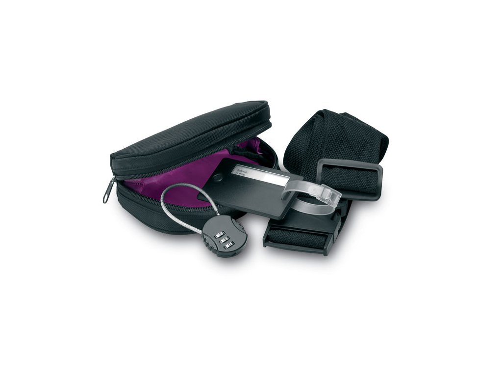 Cestovní sada obsahuje zámek na kufr, pásek na zavazadlo a jmenovku. Materiál 1680D polyester.Tento výrobek je určen jako reklamní předmět a je vhodný pro potisk Vašeho loga.