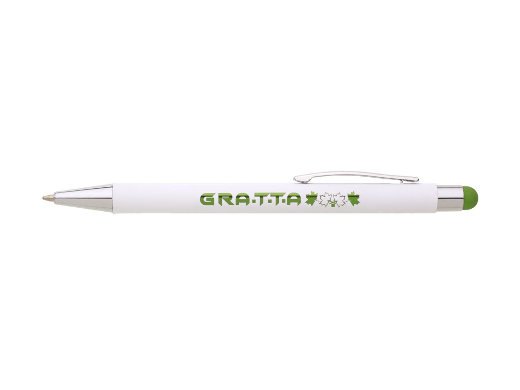 Bílá kovová propiska se zeleným touch koncem. Logo po vylaserování je v barvě touch – leskle zelená. Tento výrobek je určen jako reklamní předmět a je vhodný pro potisk Vašeho loga.S vlastním potiskem tento výrobek objednáte zde...