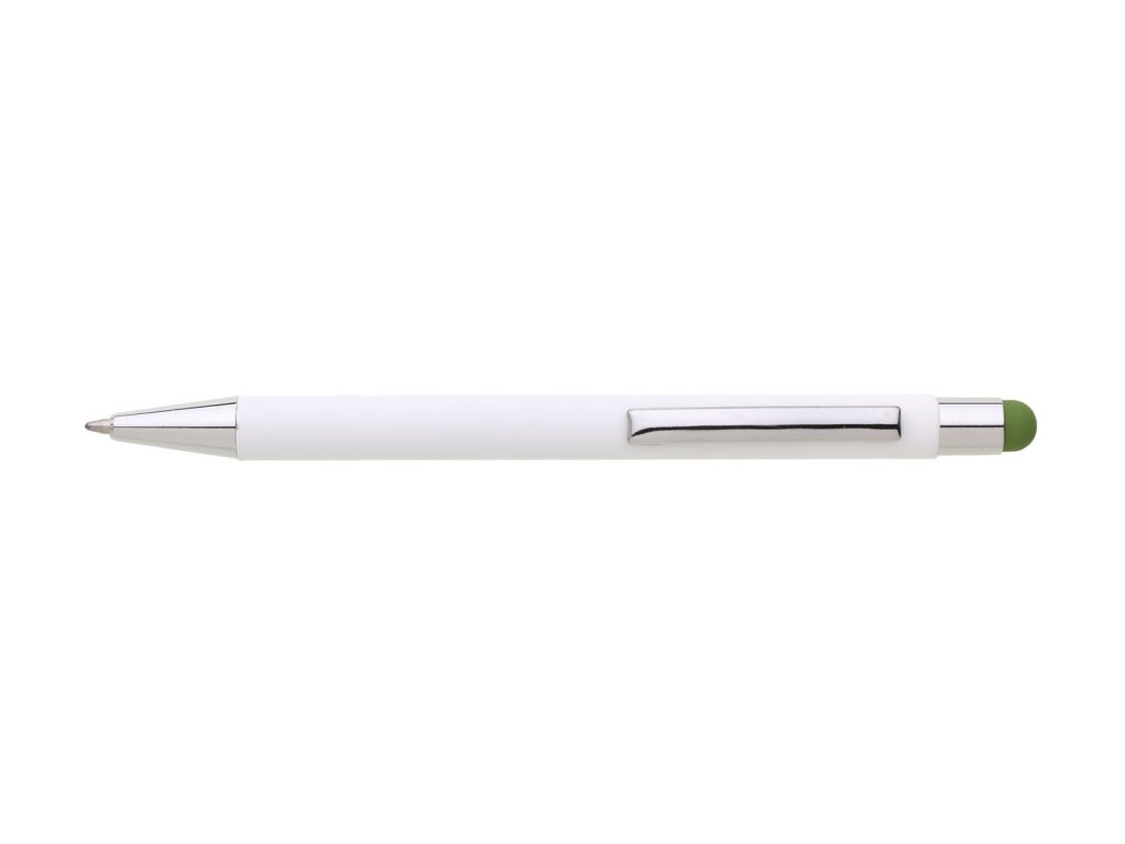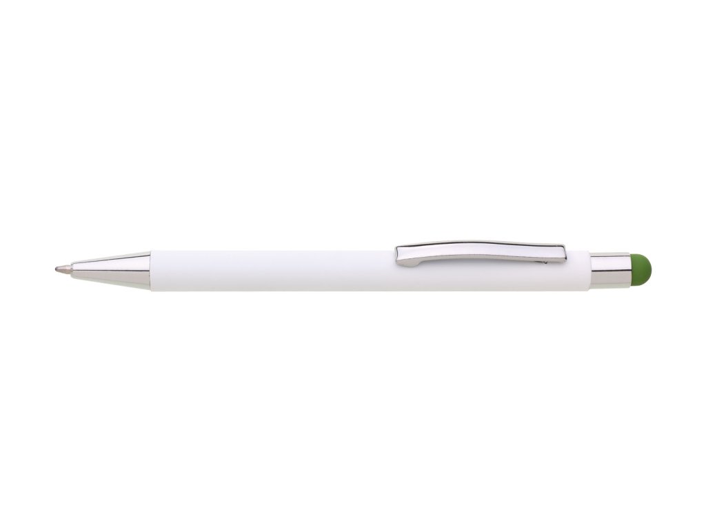 Bílá kovová propiska se soft povrchem a zeleným touch koncem. Logo po vylaserování je v barvě touch – leskle zelená. Tento výrobek je určen jako reklamní předmět a je vhodný pro potisk Vašeho loga.Rozměr: 143x10 mmNáplň: velkoobsahová