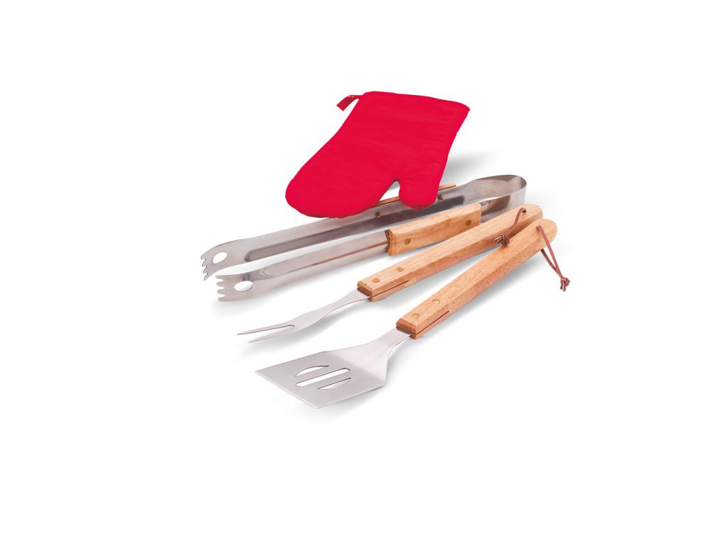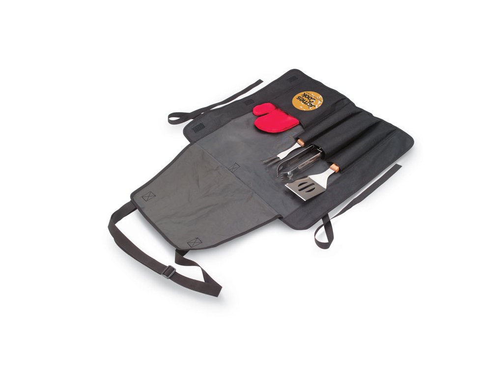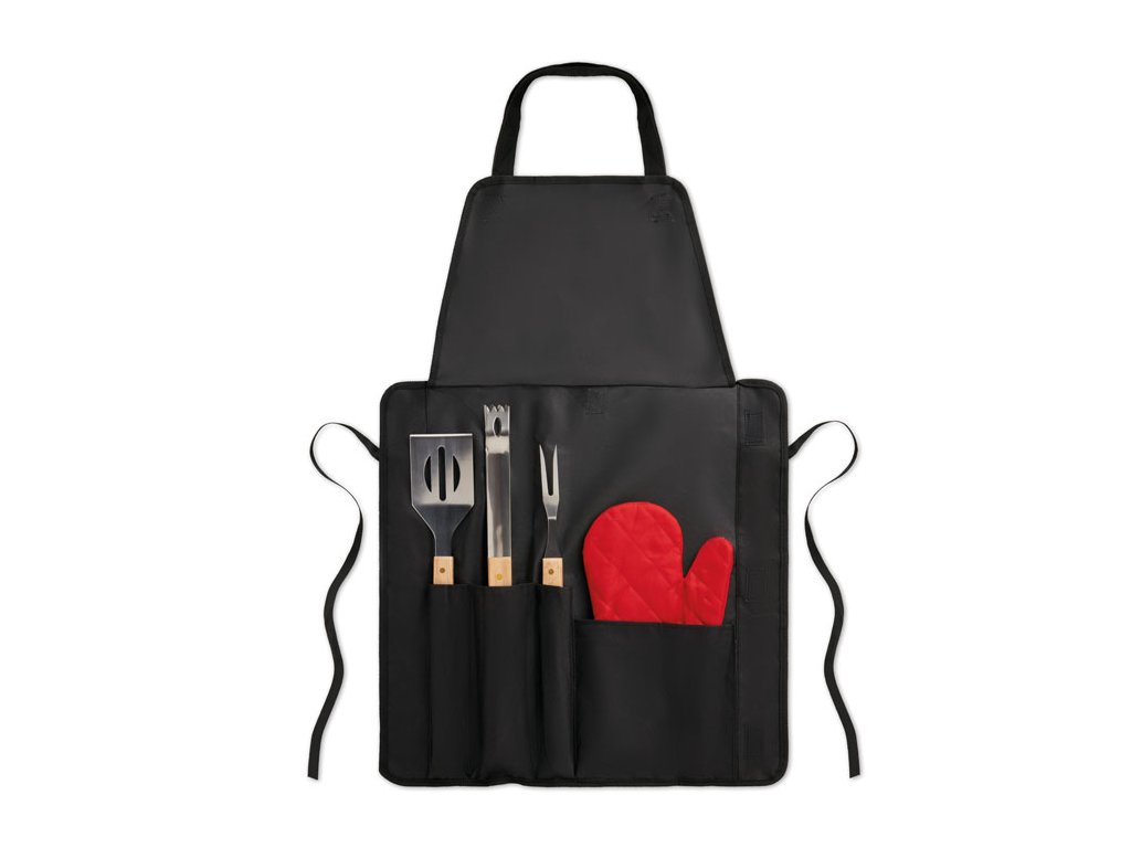 Barbecue zástěra, rukavice a nářadí. Zástěra ze 600D polyesteru.Tento výrobek je určen jako reklamní předmět a je vhodný pro potisk Vašeho loga.
