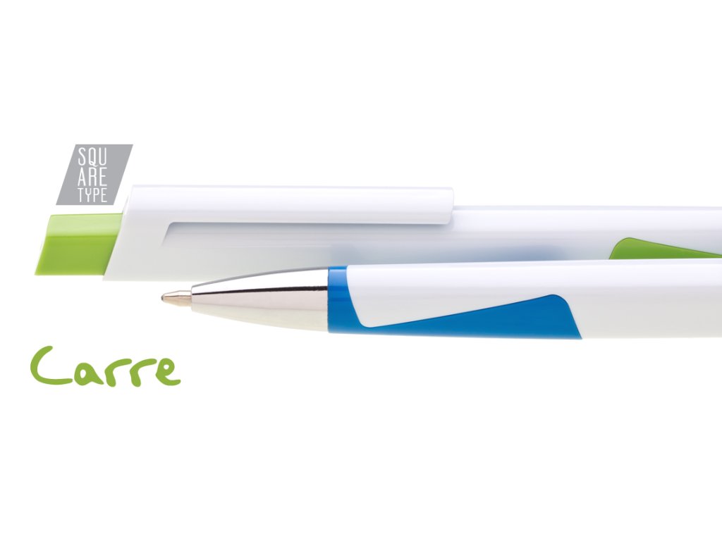 Plastová bílá propiska CARRE se čtvercovým profilem a žlutými doplňky. Ideální na uv potisk. Náplň velkoobsahová, modře píšící. Tento výrobek je určen jako reklamní předmět a je vhodný pro potisk Vašeho loga.Rozměr: 140x10 mmNáplň: velkoobsahová
