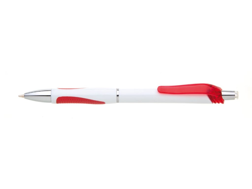 Bílá, plastová propiska s pochromovanými doplňky jako jsou klip, tělo cvakátka a proužek uprostřed těla tužky. Grip je červený, částečně pogumovaný, stejně jako klip. Náplň X20, hrot 1mm. Tento výrobek je určen jako reklamní předmět a je vhodný pro potisk Vašeho loga.Rozměr: 142x11 mmNáplň: X20-106mm