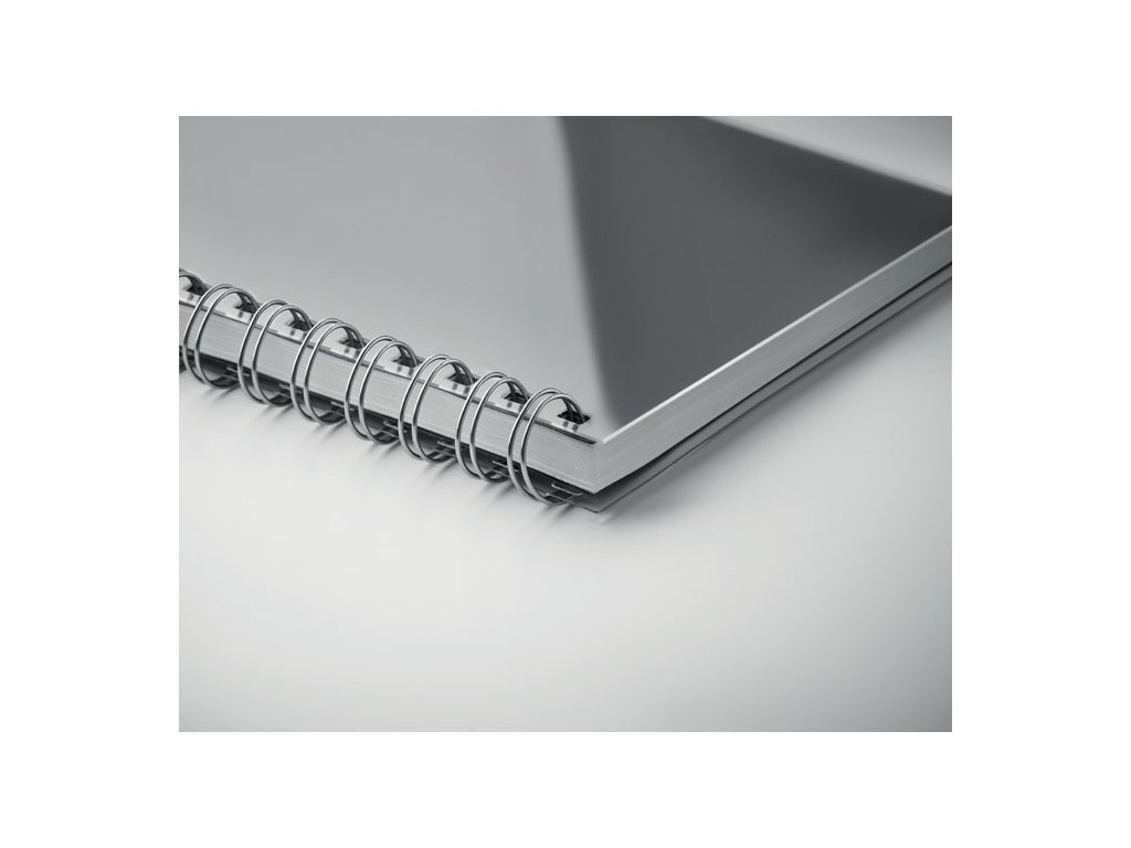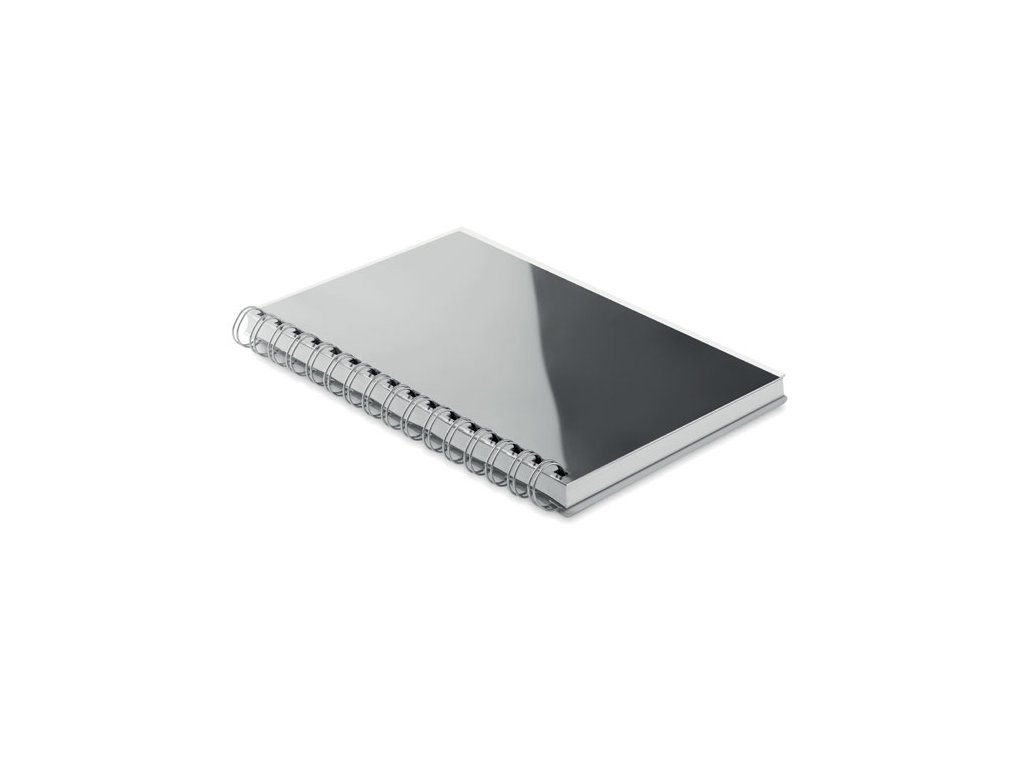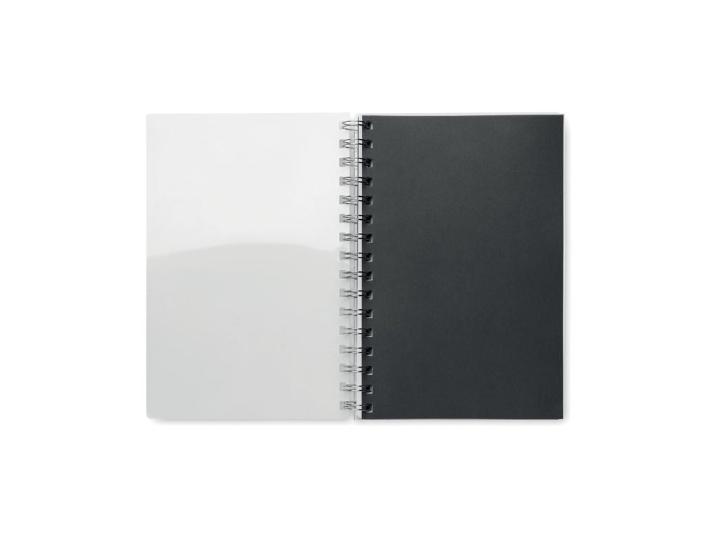 Kroužkový zápisník formátu A5 s obalem z RPET. 160 stránek (80 listů) recykloveného linkovaného papíru.Tento výrobek je určen jako reklamní předmět a je vhodný pro potisk Vašeho loga.